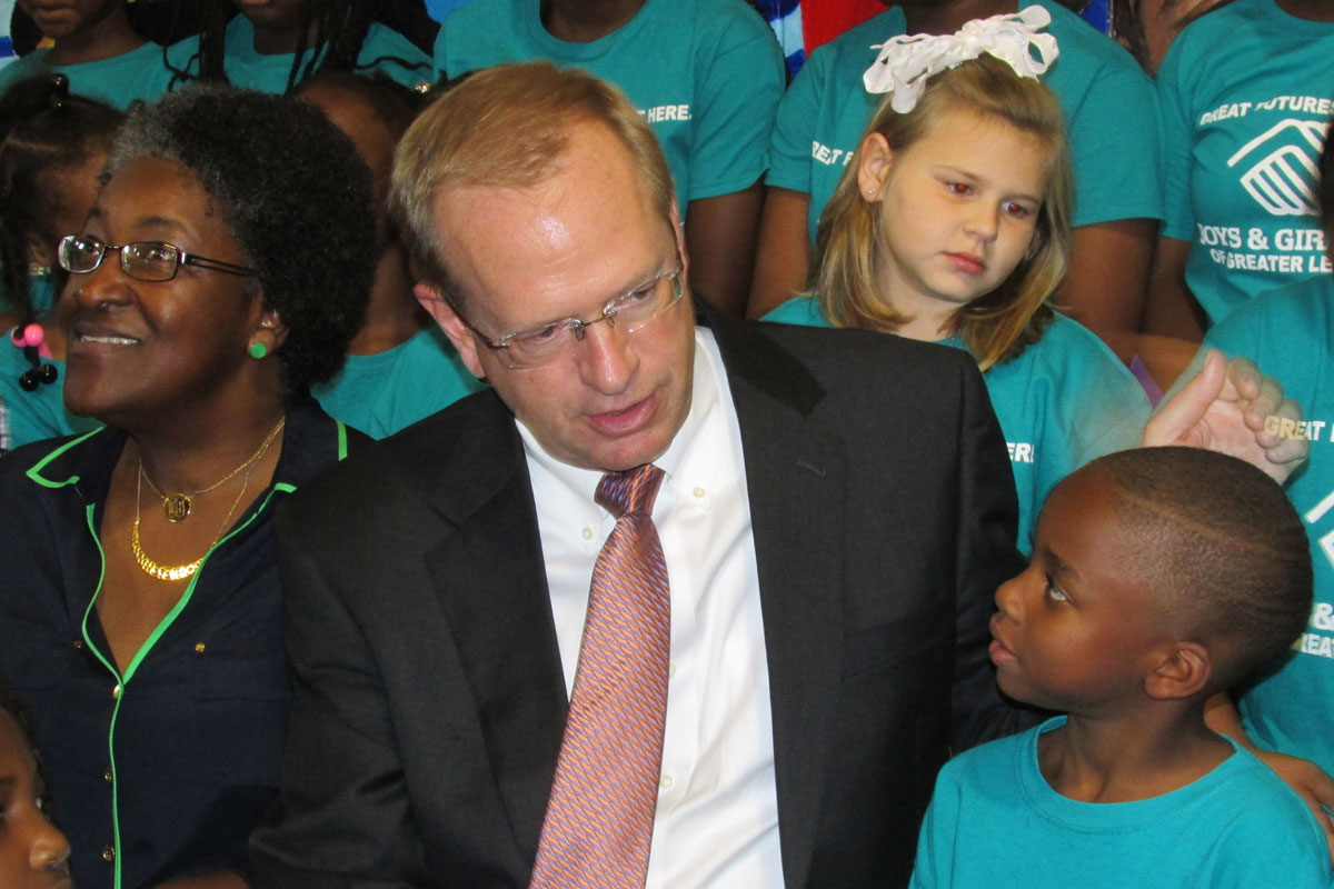 National Boys and Girls Clubs director Jim Clark visited the Opelika and Auburn clubs last week to observe and galvanize support. “I see a very passionate community – caring for the kids, making sure they have eduation, live a healthy life and become great citizens,” Clark said. “I’ve seen a lot of inspiration.” Left, Clark chats with a club greeter at the Potter-Daniel unit. Below, Clark helps Keonta Tarrence and Zaiden Walters with a math problem, with input from unit director Najeebah Swanson.