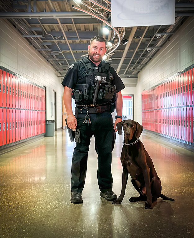 “We are constantly assessing the safety of our schools and looking for ways to prevent active attacks from occurring,” said Opelika Police Chief Shane Healey. “We also have one of the best K-9 units in the state, so we felt the best way to address gun safety in the schools was to utilize a detection canine.” Glover and K-9 Gunner underwent extensive training at Alabama Canine in Northport, Alabama, for approximately seven weeks. In addition to detection work, Gunner is also trained in tracking. Since completing the program, they have spent the past several months bonding and continuing their training.